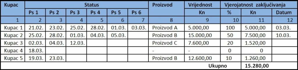 U ovom jednostavnom prikazu navedeno je pet kupaca i šest statusa koji su objašnjeni u legendi. Statusi odgovaraju načinu na koji poduzeće prodaje tj. prodajnom procesu. Svaki put kada se prodavač „pomakne“ korak naprijed u procesu rada s kupcem mijenja se status čime se povećava vjerojatnost zaključivanja prodaje. Tako je npr. kupac 2 na dan 05.03. javio prodavaču da bi želio razgovarati o ponudi koja je izdana 04.03. Ova informacija tumači se kao povećanje interesa kupca za navedenim proizvodom i vodi u promjenu statusa sa Ps 4 na Ps 5. Promjena statusa znači povećanje vjerojatnosti da će se dogoditi prodaja s 30% na 50%. Vjerojatnosti zaključivanja u % navedene su u tablici 1, stupac 10. Kada se one pomnože s procjenom vrijednosti kupnje za navedeni proizvod, prodajni program ili uslugu dobije se vagana procjena prodaje za određeni period po prodavaču. Važno je osigurati da procjena prodaje bude dinamička tj. da se vrijednosti mijenjaju kod svake promjene statusa. Tako će se osigurati da pipeline bude „živ“ i dnevno aktualan. Prodavač i direktor prodaje redovito će pratiti statuse i na osnovu njih prilagođavati svoje aktivnosti prema kupcima. Gornji prikaz je pojednostavljena verzija pipeline izvještaja. Složenije verzije mogu uključivati tekstualne zabilješke, sljedeće akcije, preporuke menadžera, izgubljene prilike itd. Danas su u upotrebi napredne on-line inačice s velikim brojem dodatnih izvješća, grafičkih prikaza i projekcija. Jednu od najpoznatijih nudi Salesforce.com
