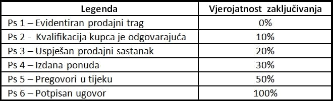 Na pitanje kako odrediti postotke vjerojatnosti zaključivanja nema egzaktnog odgovora. Što više iskustva i više pokušaja prodaje, procjena vjerojatnosti će biti točnija. Dobri prodavači znaju da npr. deset prodajnih tragova (engl. sales lead) nakon postupka kvalifikacije može dati samo jednu prodajnu priliku (engl. opportunity) ili da npr. jedan od dva pregovaračka ciklusa rezultiraju prodajom. Zahvaljujući prodajnom iskustvu i CRM-u prosječno poduzeće će imati elemente za određivanje postotaka vjerojatnosti. Vjerojatnosti nisu konstantne pa ih treba prilagođavati situaciji i tržištu. Ako je prije npr. pet godina 50% pregovora rezultiralo potpisivanjem ugovora to vjerojatno nije primjenljivo na današnju situaciju krize pa će poduzeće ovdje korigirati vjerojatnost zaključivanja.