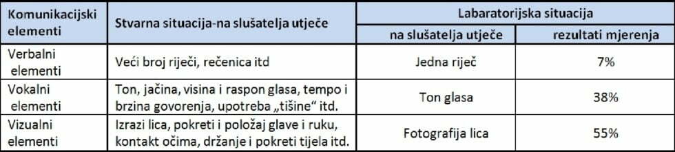 U 2. stupcu navedeni su značajni elementi koji čine stvarnu komunikacijsku situaciju, a u 3. stupcu elementi koje su bili podloga za istraživanje i mjerenje. Razlika je očita i predstavlja važno ograničenje u primjeni pravila „3V“. U 4. stupcu navedeni su rezultati mjerenja koji ukazuju na relativnu važnost komunikacijskih elemenata u opisanim uvjetima.